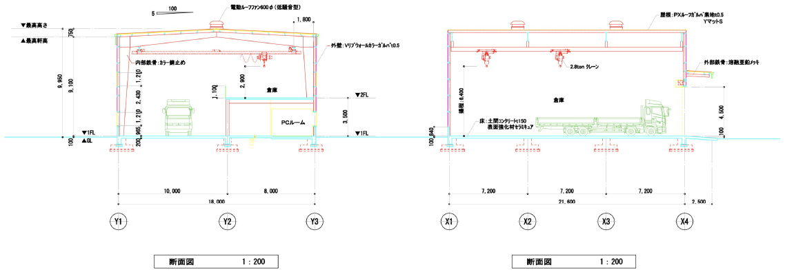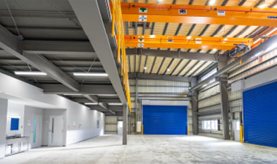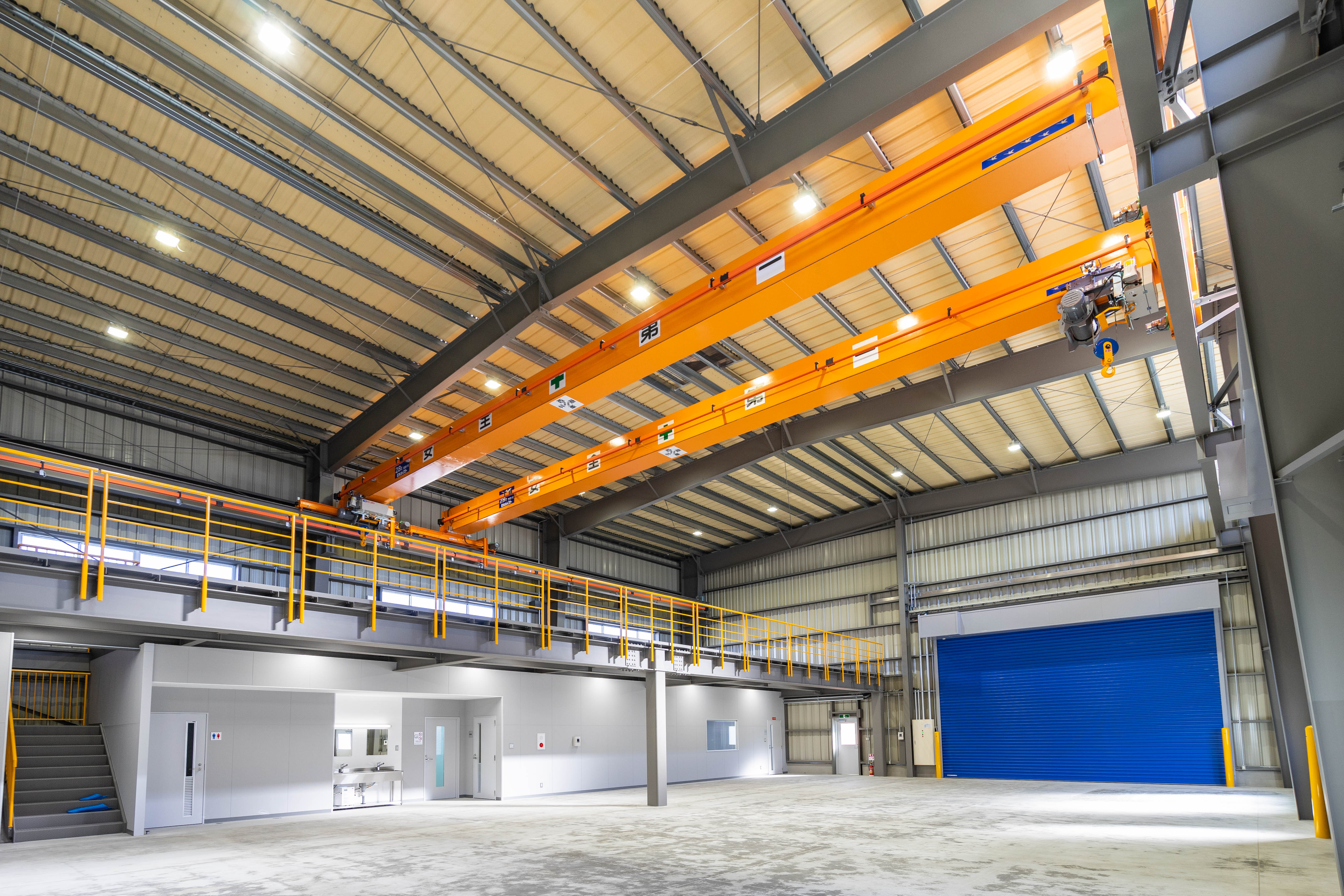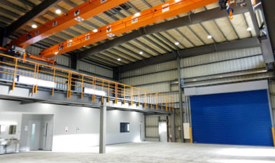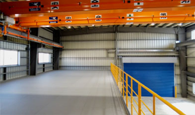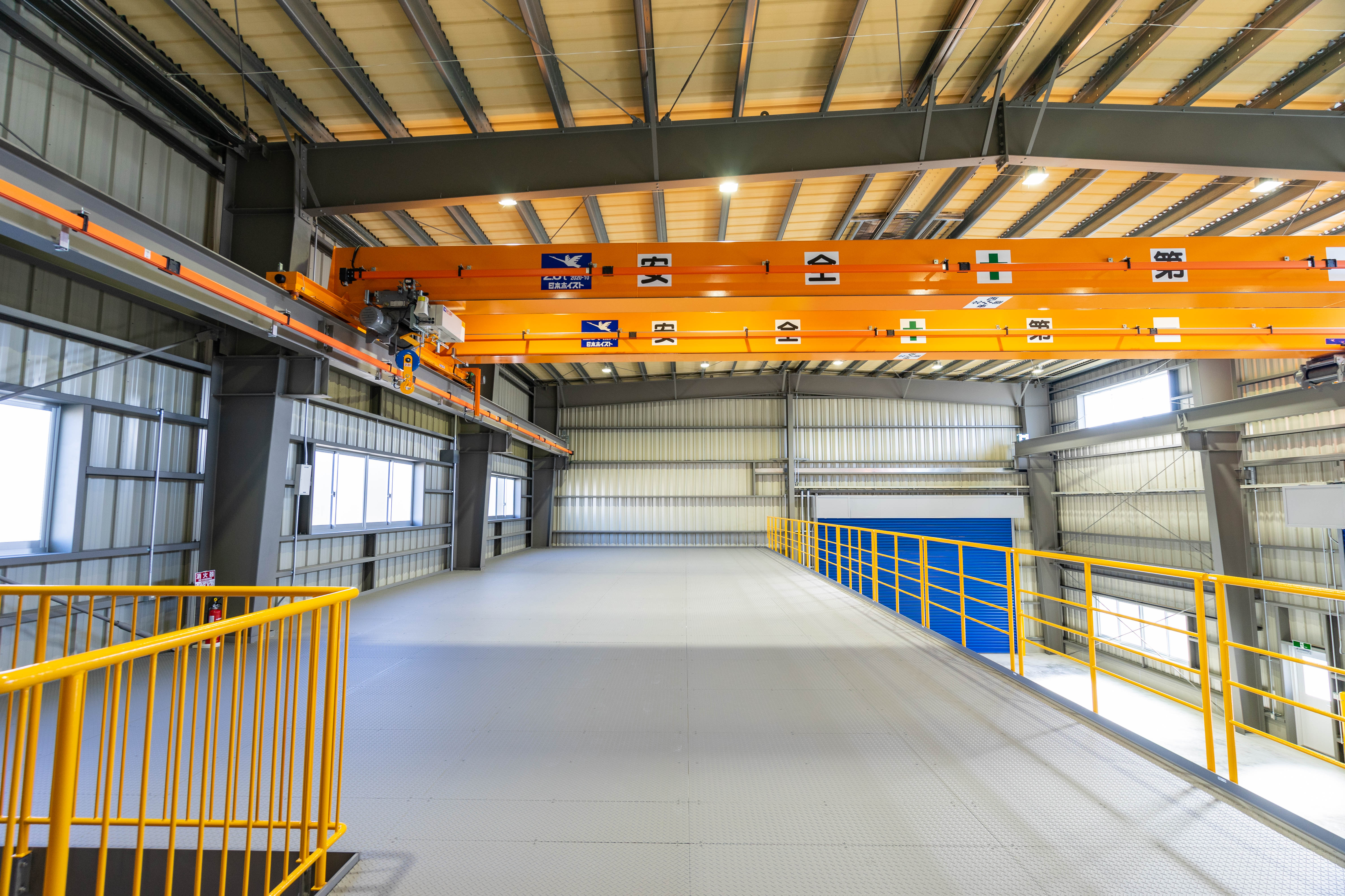 ユニット倉庫内の天井クレーンにて専用トラバーサを使用し、協力業者トラックに積込みを行い、現場までの搬送を行います。
